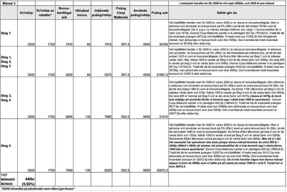 Om vi följer Matpriskollens exempel som tidigare med att man handlar för 8000kr i månaden kommer man i slutet av månad 2 upp på förmånssteg 4, där man sedan får 50 kr i bonus för varje 2500 kr man handlar för, eller 2%.