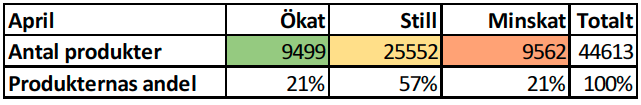 Sammanfattar man april kan man säga att priser höjs och sänks i större omfattning än vanligt. Det är nervöst hos aktörerna då hela 21 procent av artiklarna höjdes och 21 procent sänktes i pris under månaden. Handlarna och kedjorna justerar och försöker sätta rätt pris mot sina kunder utifrån vad konkurrenterna tar.