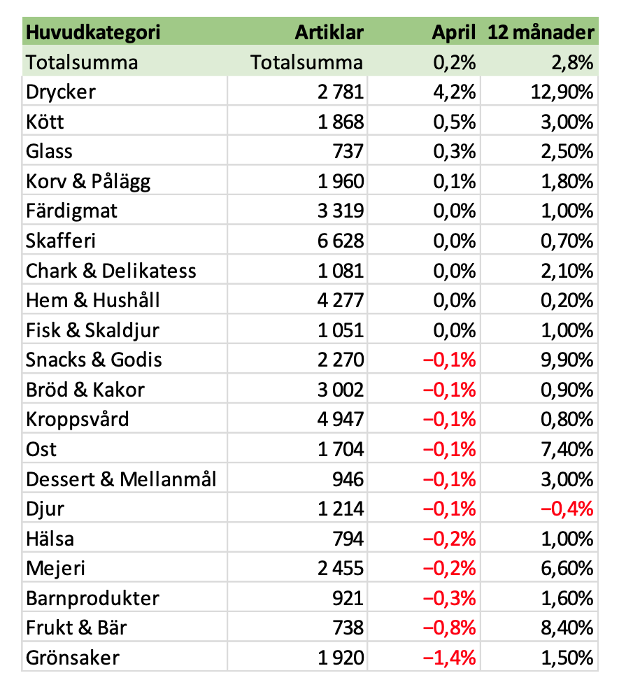 | 12 månader | +2,8% | (+4,0% mat) 36.018 artiklar | EMV +2,6% (9.762 art) |