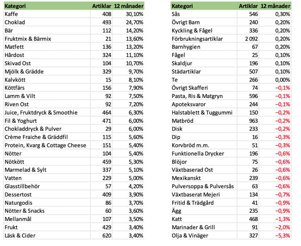 Stora ökningar på kategorierna Kaffe med +30% (Bryggkaffe med +47%), Choklad +25% (Bakchoklad +46%, Chokladkakor +31%) och Matfett +13% (Smör 21%). Prissänkningarna är stora på Oljor & Vinäger (Olivolja –9%) och Marinader & Grill –2% (BBQ-sås –2,9%).