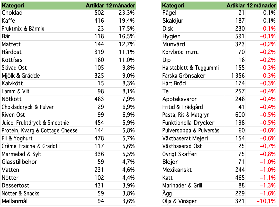 | 12 månader | +2,5% | (+3,5% mat) 35.832 artiklar | EMV +2,3% (9.846 art) |