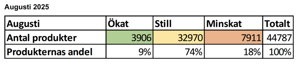 | Augusti | +0,0% | (+0,0% mat) 44.787 artiklar | EMV -0,1% (12.270 art) |