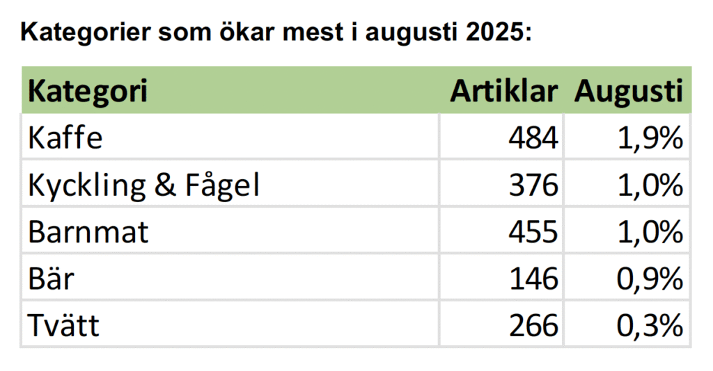 De prisökningar som registrerats under månaden kommer bland annat från kyckling, bär, barnmat, tvättmedel och kaffe. Kaffet ökade med 1,9 procent vilket främst drivs av snabbkaffe(4,6%) samt kapslar och hela bönor. Ökningen har kommit tvärt och oväntat.