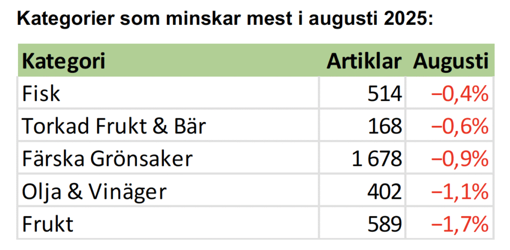 Det som minskade i pris under augusti hittas främst i frukt- och gröntavdelningen. Vindruvor minskade exempelvis med 10 procent, päron med 9 och äpplen med 4,4. Lök minskade med 3,8 procent där purjolöken hos Ica exempelvis blev 18-20 procent billigare. Morötter hos Coop har också blivit 6-18 procent billigare. Även olja och vinäger minskar vilket drivs av olivolja som i genomsnitt minskat med 18 procent på ett år. Kokosoljan har i stället ökat med 12 procent senaste året.