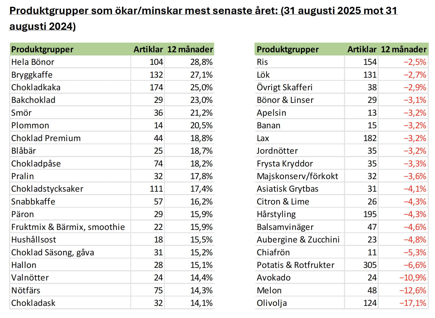 Kaffe +1,9%, drivet av snabbkaffe +4,6%, kapslar och hela bönor. Bryggkaffe förväntade Matpriskollen en prissänkning, då råkaffepriset sjunkit rejält under sommaren, men ett tvärt kast uppåt på råkaffet i början på augusti verkar ha ställt till det för rosterierna som nu agerat väldigt olika. Detta syns mellan Arvid Nordqvist som sänkte med 6 kr/paket och Zoeas (Nestlé) höjde med 3 kr/paket på Willys. En ökad skillnad på 18 kr/kg.