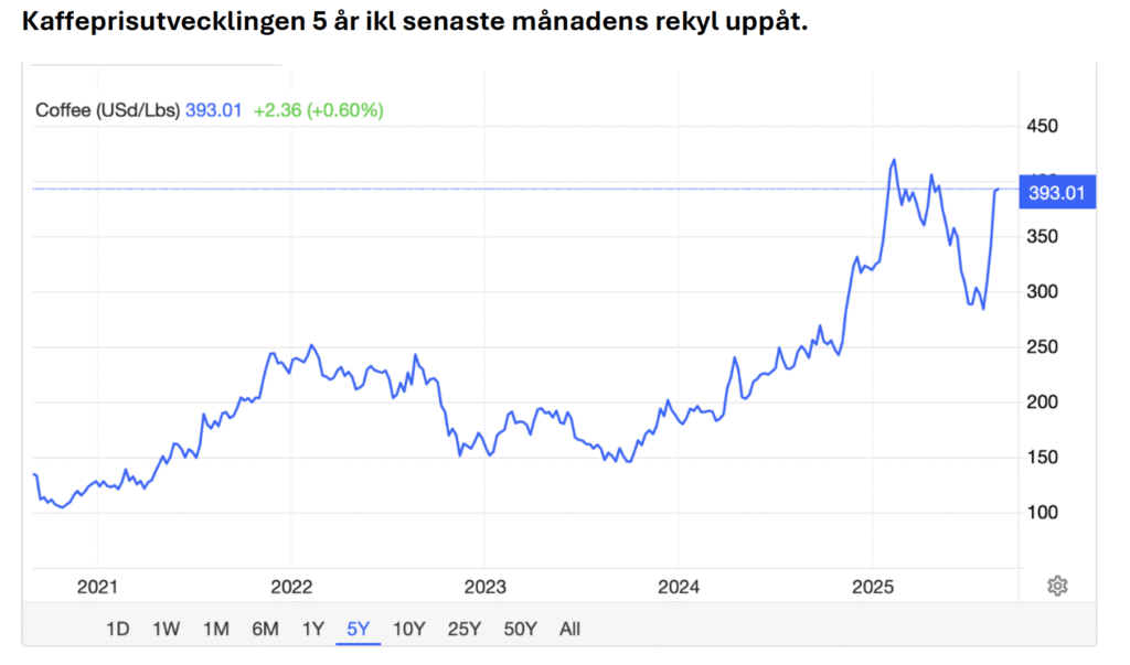 Kaffepriset på världsmarknaden steg till nästan 400 cents/pound sista veckan i augusti. Torrt väder i Brasilien, små lager och fortsatt hög efterfrågan skapar press uppåt, smtidigt som tullarna på 50% mot Brasilien skakar om även kaffemarknaden.