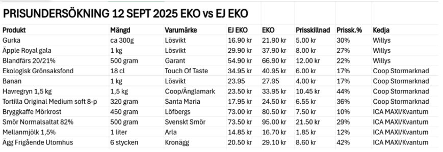 I slutet av augusti 2025 genomförde Matpriskollen en prisundersökning med syftet att kartlägga prisbilden på ekologiska livsmedel i Sverige. Undersökningen omfattade 40 ekologiska varor. För att säkerställa jämförbarhet och tillgänglighet valdes endast produkter som fanns i samtliga undersökta kedjor.