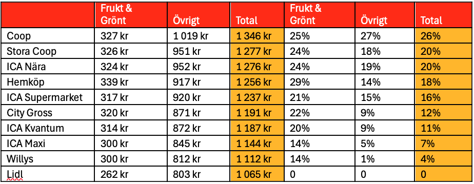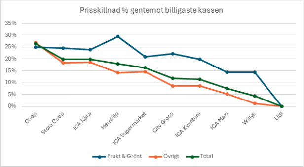 Resultaten visar att det finns betydande prisskillnader mellan olika butikskedjor, särskilt när det gäller ekologiska varor. Lidl utmärker sig som den mest prisvärda butiken i samtliga kategorier, med Willys och ICA Maxi 4-7 procent dyrare. Hemköp utmärker sig med dyraste Frukt och Gröntpriset, medan Coop tenderar att ligga i det övre prisskiktet.