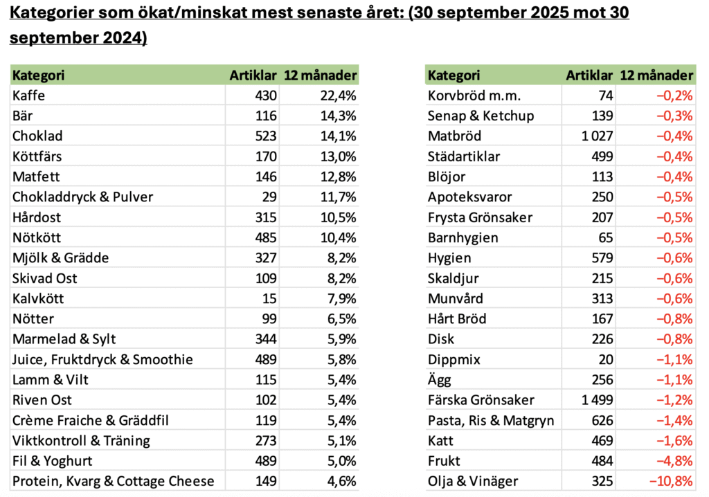 – Helt naturligt då vi går in och ur säsonger. På kaffet är det kategorin snabbkaffe och kaffekapslar som ökat med hela 4 respektive 5 procent.