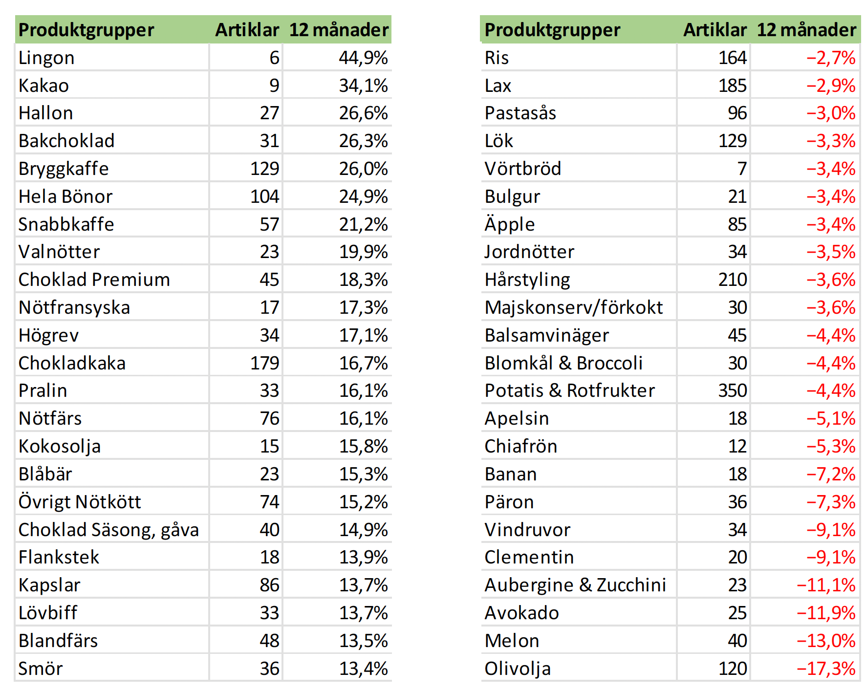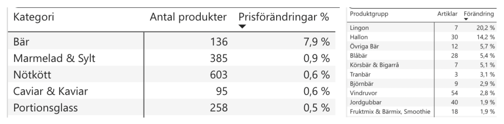 Mest prishöjda/sänkta kategorierna senaste 12 månaderna: