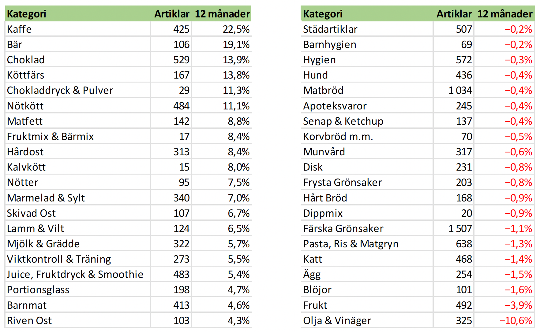 | 12 månader | +2,2% | (+3,2% mat) 37.355 artiklar | EMV +1,9% (10.379 art) |