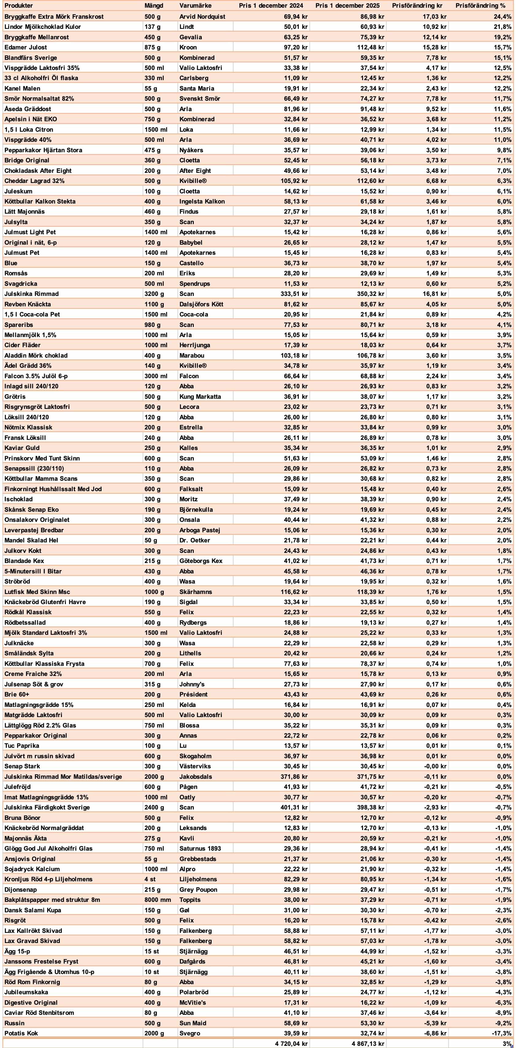 Topplista: Varor som ökat mest i pris (urval från Julkassen 2025)