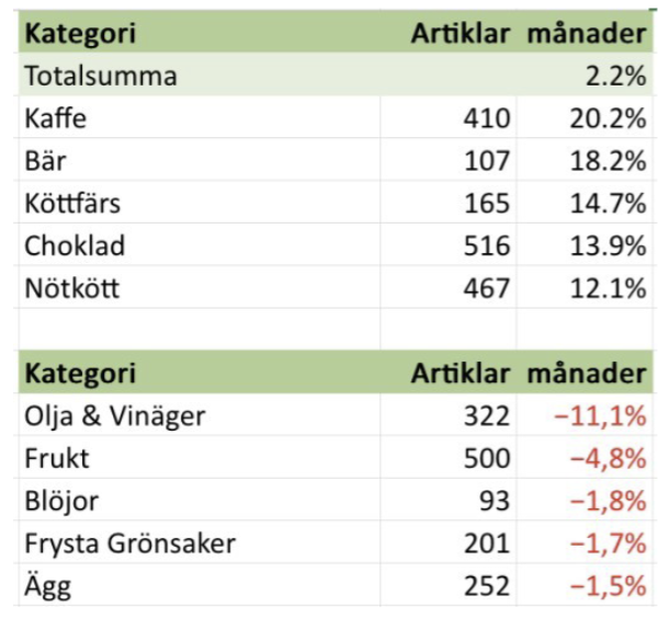 | 12 månader | +2,2% | (+3,1% mat) 37.063 artiklar EMV +1,9% (10.479 art) |