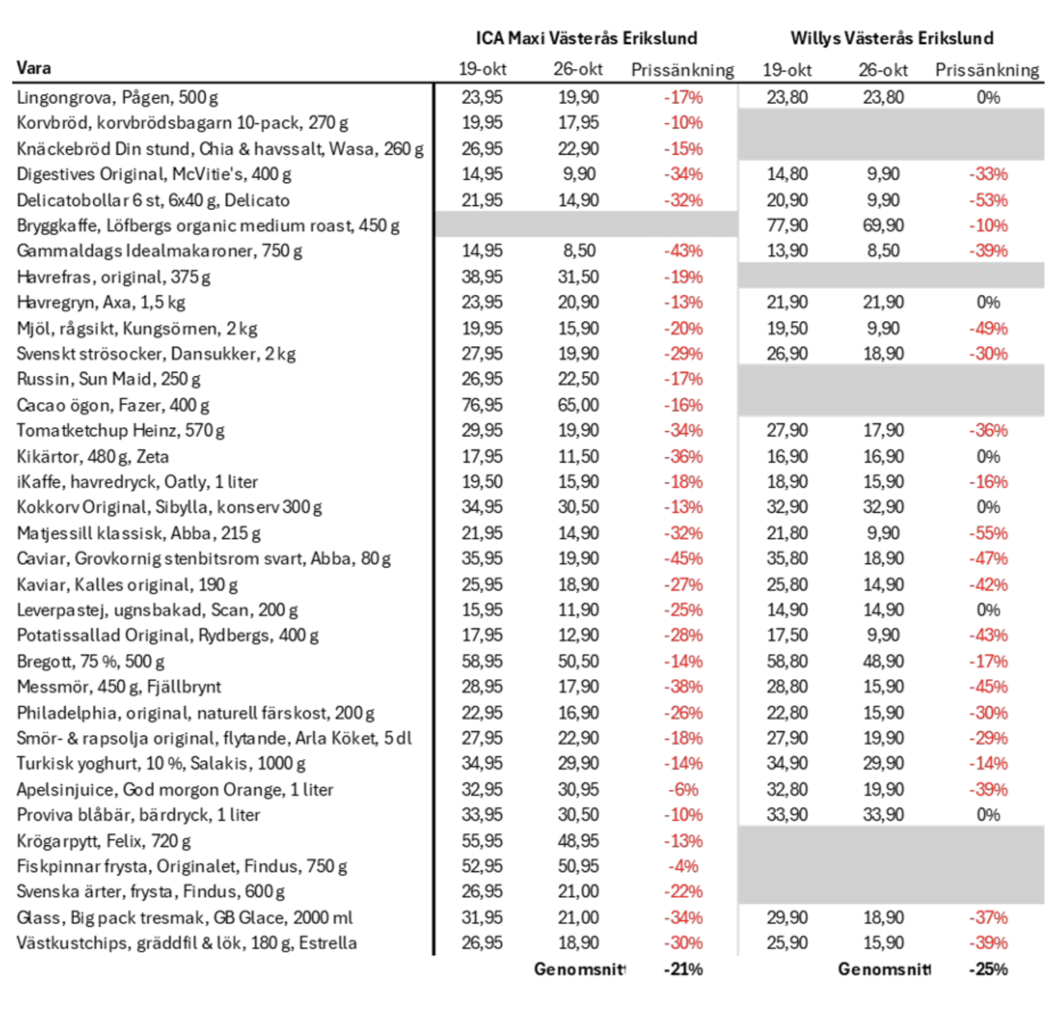 I november så har även Stora Coop Mitt sänkt ordinariepriserna rejält på 3000 artiklar. Sänkningen sker i ett antal Stora Coopbutiker, vilket gjorde att genomsnittssänkningen blev –0,1 procent på Coop. Coop har fortfarande ökat sina priser mest senaste 12 månaderna, men nu har även de inlett en prissänkningsoffensiv.