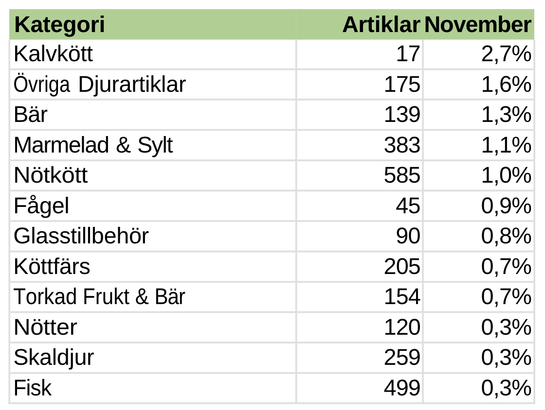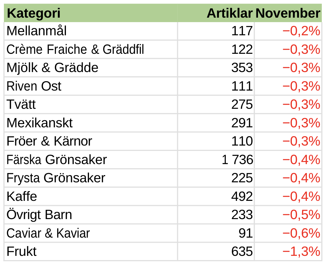 | November | +0,0% | (+0,0% mat) 45.277 artiklar EMV +0,0% (12.474 art) |