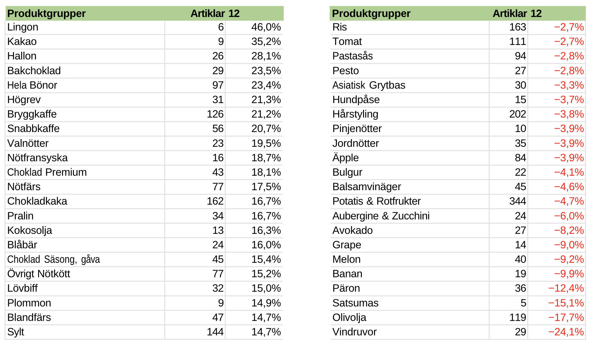 Top 5 varukategorier som ökat/minskat mest senaste 12 månaderna: